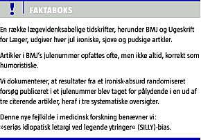 Artikler i BMJ's julenummer opfattes ofte korrekt som humoristiske. Imidlertid kan den humoristiske dimension overraskende let overses. Vi har således dokumenteret eksempler på en ny fejlkilde i medicinsk forskning: SILLY-bias, både i citationspraksis og i metaanalyser.