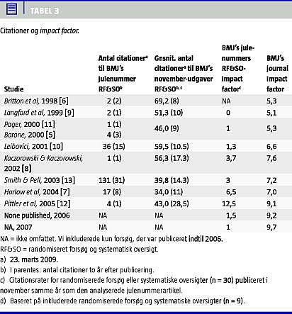 Seks artikler blev kun citeret 1-3 gange inden for to år efter offentliggørelsen, mens tre artikler blev citeret 8-31 gange [7, 10, 13] (Tabel 3). Impact factor baseret på citationer af randomiserede forsøg og systematiske oversigter offentliggjort i BMJ's julenummer var nul i 1999 og en i 2007 med et gennemsnit på 3,1 for hele perioden 1999-2007 - og dermed lavere end BMJ's officielle journal impact factor (Tabel 3).