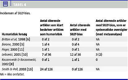 Summary A new scientific source of bias: SILLY bias. Analysis of citations of BMJ's Christmas articles Ugeskr Læger 2009;171(51):3784-3789 We analysed the scientific impact of systematic reviews and randomised trials published in the BMJ Christmas issues 1997-2006. The articles were mostly interpreted correctly as humorous, but the humorous dimension was overlooked with surprising ease. The result from one ironic-absurd trial on the effect of retroactive remote intercessory prayer for patients already dead or dismissed was taken at face value in 12/36 of the citing articles, and mortality data was unconditionally included in three systematic reviews. Thus, we document a new type of bias in medical research: Serious Idiopathic Loss of Ludic ironY (SILLY) bias, both in citation practices and in metaanalyses.