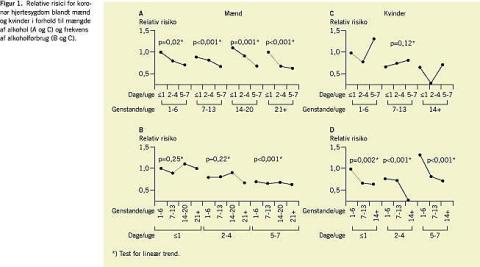 Blandt de mere end 50.000 deltagere i Kost, kræft og helbredskohorten fandt vi en stærk sammenhæng mellem høj drikkefrekvens og lav risiko for koronar hjertesygdom blandt mænd. Denne sammenhæng synt es at være uafhængig af det samlede ugentlige alkoholforbrug. For kvinder fandt vi derimod, at det samlede ugentlige forbrug var en stærk prædiktor for en lavere risiko for koronar hjertesygdom, som syntes at være uafhængig af drikkefrekvensen.