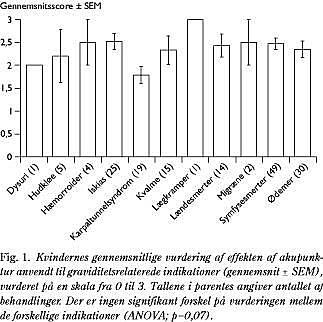 Resultater: I alt 691 kvinder fik akupunktur 997 gange (1,4 ± 0,5 indikationer per kvinde) til behandling af 22 indikationer. Smertelindring og anspændthed udgjorde 78,8% af indikationerne. Jordemødrenes og kvindernes vurderinger af effekten var nøje korrelerede, idet hhv. 42,2% og 40,6% angav »fuld effekt« og hhv. 33,3% og 33,4% angav »nogen effekt«. Jordemødrenes vurdering var uafhængig af kvindernes alder, paritet, gestationsalder og indikation(er). Der blev observeret en mulig bivirkning (temporær dropfod).