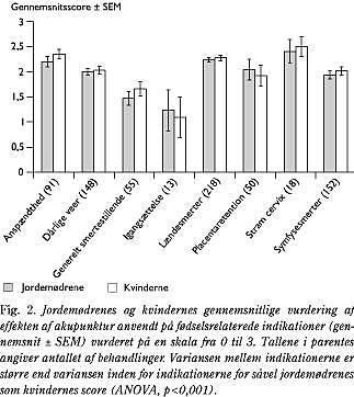 Der blev givet akupunktur på 22 indikationer, hvoraf de hyppigste var: lændesmerter hos fødende (23,4%), symfysesmerter hos fødende (16,4%), vesvækkelse (15,4%), anspændthed (9,4%), generel smertelindring (5,9%), symfysesmerter hos gravide (5,3%), placentaretention (5,0%) og lændesmerter hos gravide (4,1%). Fig. 1 viser gennemsnittet af kvindernes vurdering af akupunkturens effekt på de graviditetsrelaterede indikationer. Fig. 2 viser gennemsnittet af kvindernes og jordemødrenes vurdering af akupunkturens effekt på de fødselsrelaterede indikationer.