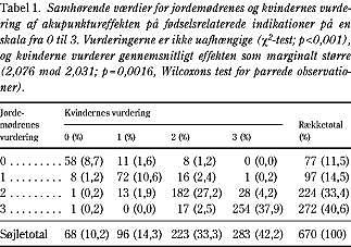 Jordemødrenes og kvindernes vurdering af akupunktureffekten på fødselsindikationerne fordelte sig som vist i Tabel 1 . Vurderingerne var ikke uafhængige (χ2 - test; p < 0,001), og kvinderne vurderede gennemsnitligt effekten marginalt større (2,076 mod 2,031; p = 0,0016, Wilcoxons test for parrede observationer). Jordemødrenes vurdering var uafhængig af kvindernes alder, gestationsuge, paritet, og hvorvidt de var gravide eller i fødsel (ANOVA; p > 0,12). Kvindernes vurdering var uafhængig af deres alder (ANOVA, p = 0,14), men afhængig af gestationsuge (ANOVA, p < 0,0001) og paritet (Kruskall-Wallis test, p < 0,0003).