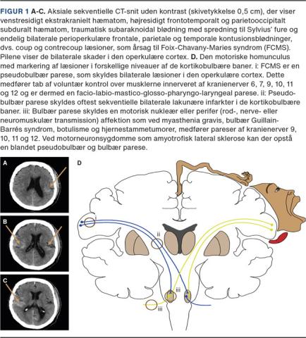 En 74-årig mand med skizofreni, hypertension og hyperkolesterolæmi pådrog sig et hovedtraume med synlig venstresidig ekstrakraniel kontusion. Ved ankomsten til hospitalet var patienten vågen og kunne efterkomme opfordringer samt bevæge alle fire ekstremiteter, men kunne ikke tale. Han kunne gå uden assistance, men var ikke i stand til at bevæge ansigtsmuskulaturen. Munden var åben med påvirket synkefunktion, spytflåd, bilateral ganesejlsparese, og forsøg på at tale bestod af uforståelige grynt. Fiberskopi viste nedsat adduktion af stemmelæberne. Der blev fundet livlig kæberefleks, svælg- og ganeseglsparese samt minimal bevægelse af tungen lateralt. Der var ingen tungeatrofi eller fascikulationer. De øvrige kranienerver var intakte. Relevant ja/nej-kommunikation kunne etableres, og endelig var patienten i stand til at skrive relevante korte sætninger. CT af cerebrum viste kontusionsblødninger bilateralt i de frontale, parietale og temporale operculae (Figur 1). De sproglige deficit var uændrede en måned efter debut.