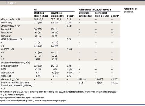 I AF-klinikken blev 99% (170 ud af 172) af patienterne med en CHA2DS2-VASc score ≥ 1 antikoaguleret sammenlignet med 80% (143 ud af 179) af patienterne i den konventionelle gruppe (p < 0,001). De to patienter i AF-klinikken, der ikke blev antikoaguleret trods indikationen, havde begge efter grundig information fravalgt behandlingen. I den konventionelle gruppe var