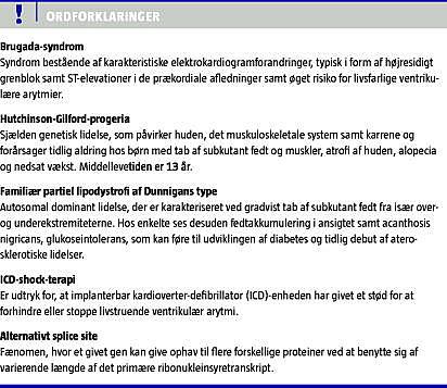 Summary Another genetic cause of sudden cardiac death Ugeskr Læger 2011;173(3):190-193 Mutations in the Lamin A/C gene (LMNA) are a new part of the spectrum of genes responsible for sudden cardiac death (SCD). Relatives of SCD-cases should receive counselling, clinical assessment and perhaps molecular screening. The consequence of being an LMNA mutation carrier is discussed with regard to counselling and prophylactic measures. Device therapy may be relevant in LMNA-mutation carriers, although the proper time for implantation is uncertain. However, we recommend LMNA genetic screening in SCD cases with dilated cardiomyopathy as well as cases with unexplained SCD.