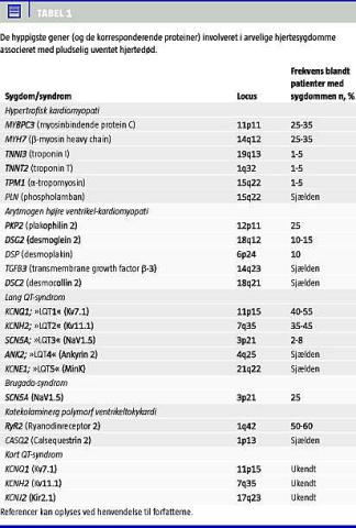 Der optræder årligt omkring 55 hjertestop pr. 100.000 indbyggere uden for hospitalerne [3]. Af disse overlever omkring 6,5 procent. Antallet af hjertestop må dog ses som en underestimering, da de repræsenterer tilfælde, hvor der er tilkaldt ambulance og påbegyndt genoplivning. Det er tidligere estimeret, at der er omkring 10.000 tilfælde af SCD årligt i Danmark, hvor de 1.500 er under 50 år [4]. Årsagen til SCD vil for gruppen over 30 år hovedsagelig være iskæmisk hjertesygdom, mens det for gruppen under 30 år ofte vil være arvelige arytmisygdomme (Brugada-, lang QT (LQTS)- og kort QT (SQTS)-syndrom, samt katekolaminerg polymorf ventrikeltakykardi (KPVT)) eller strukturelt betingede hjertesygdomme (hypertrofisk kardiomyopati (HCM) samt arytmogen højreventrikelkardiomyopati (ARVC)) [5, 6]. Hvor de strukturelle lidelser - inklusive iskæmi - oftest vil blive belyst ved obduktion, vil tilfældene, der er betinget af arytmiforstyrrelser, oftest fremtræde med normale hjerter. I gruppen af SCD-tilfælde under 35 år vil mellem 5% og 30% have helt normal obduktion. Blandt disse vil 40-53% af tilfældene kunne forklares ved en mutation [7, 8]. Der er fundet mutationer i talrige af de gener, der er associeret med de arvelige hjertesygdomme, som disponerer for SCD. De hyppigste fremgår af Tabel 1 med undtagelse af de gener, der er ansvarlige for iskæmisk hjertesygdom, da denne sygdomskategori oftest vil erkendes ved obduktion.