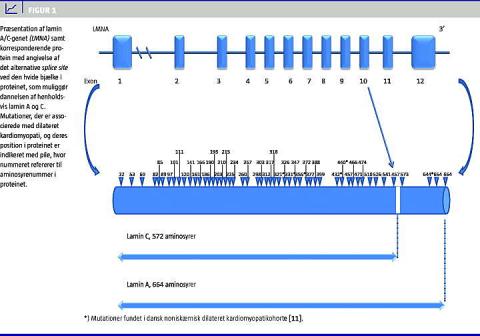 Hjertets involvering ved laminopatierne kan enten være isoleret eller ledsaget af nogle af de andre kliniske sygdomsenheder. Der er tiltagende evidens for høj penetrans, dvs. at en stor del af mutationsbærerne udvikler sygdom, dog oftest efter trediveårs-alderen. Klinisk udvikler patienterne hyppigt tiltagende hjertesvigt, som eventuelt nødvendiggør hjertetransplantation, samt arytmi i form af atrieflimren/flagren, AV-blok, grenblok og/eller ventrikulære arytmier. Mutationer i LMNA er den hyppigste årsag til familiær DCM blandt kaukasiere med en frekvens på 7,5% i såvel amerikanske som danske kohorter [10, 11]. Et nyligt arbejde af Pasotti et al [12] viste, at 62% fra deres DCM-kohorte, som var bærere af en LMNA -mutation, udviklede livstruende arytmier (den mediane opfølgningsperiode var på 57 måneder (36-107 måneder)).
