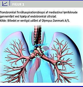 Endobronkial ultralyd (EBUS) er en relativt ny minimalt invasiv undersøgelsesmetode, der gør det muligt at visualisere og foretage transbronkial finnålsaspirationsbiopsi (TBNA) af stukturer omkring trachea og det centrale bronkietræ. Se Figur 1 . Det er internationalt anerkendt som en sikker og pålidelig metode, der senest er beskrevet i Ugeskrift for Læger i marts 2009 [1, 2]. EBUS-TBNA vinder indpas i Danmark som en vigtig del af udredningen af patienter med lungetumores og foretages i dag på mere end ti lungemedicinske og thoraxkirurgiske afdelinger landet over. Metoden forudsiges at revolutionere bronkoskopien pga. muligheden for - minimalt invasivt - at undersøge og bioptere vævet i mediastinum. Dette har stor betydning i mange sammenhænge, ikke kun hos cancerpatienter, men også hos patienter med infektionssygdomme, reumatologiske og hæmatologiske lidelser, herunder også immunsupprimerede patienter [5]. EBUS kræver erfaring med både ultralyd og bronkoskopi, hvilket afholder mange fra at give sig i kast med metoden. På Rigshospitalet har Lungemedicinsk og Thoraxkirurgisk Klinik i samarbejde indført EBUS til patienter med uafklaret mediastinal lymfadenopati eller tumores. Her præsenteres erfaringerne med de første 100 patienter.