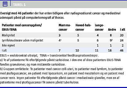 Patienterne med kendt cancersygdom er opdelt efter cancertype i Tabel 1 . Histopatologisk undersøgelse fra EBUS-TBNA påviste metastaser i mediastinum hos 20, mens 24 patienter fik afkræftet malignitet i mediastinalt forstørrede lymfeknuder. To af disse døde kort tid efter af dissemineret larynxcancer. Hos to patienter var materialet, der var udtaget via EBUS-TBNA, uegnet til diagnostik pga. udbredt nekrose; ved opfølgning havde begge disse patienter cancer i mediastinum.