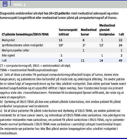 EBUS er en relativt ny undersøgelsesmetode i Danmark, og den anvendes primært til vurdering af lymfeknudestatus forud for behandling af lungecancerpatienter. På baggrund af de henviste patienters forskellige grundsygdomme har vi i et tertiært center haft fri mulighed for at anvende EBUS-FNAB til samtlige forandringer, der var påvist i mediastinum og peribronkialt. Af resultaterne fremgår det, at metoden også er velegnet til at diagnosticere metastaser fra ikketorakale cancere, dvs. mamma-, testes- og coloncancere, forudsat at der blev udtaget rigeligt materiale til histologisk diagnostik og immunhistokemi. Eksempelvis havde vi en patient med tidligere testiscancer, der efter immunhistokemi på aspiratet fik konstateret metastaser af embryonalt karcinom i mediastinum.