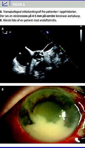 En efterfølgende udredning med transøsofageal ekkokardiografi viste en 4-5 mm stor ekskrescens på venstre koronare aortakusp, moderat aortainsufficiens og let ikke hæmodynamisk betydende mitralinsufficiens (Figur 1 A). På kardiologisk afdeling blev der iværksat systemisk antibiotikabehandling, mens patientens endoftalmitis blev behandlet med intravitreale og topikale antibiotika. Bloddyrkninger og mikrobiologisk svar fra vitrektomien viste hæmolytiske streptokokker gruppe B, følsomme for penicillin. Som led i fokusjagt udførte man en positronemissionstomografi-computertomografi og efter mikrobiologisk anbefaling undersøgelse af tænder, genitalia og urinveje, uden at der blev fundet et sikkert primært infektiøst fokus.