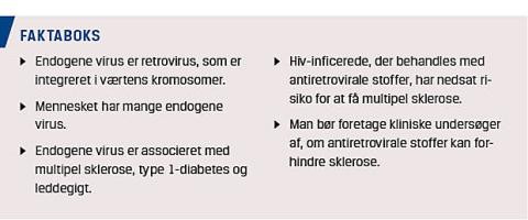 jo næsten alle behandles med antiretrovirale stoffer, sjældnere har sklerose end andre. En dansk registerundersøgelse bekræftede nærmest, at dette var tilfældet. Der skulle have været 3,5 nye tilfælde af sklerose blandt patienter med hiv i Danmark i perioden 1994-2011. Der var kun et [18]. Problemet var, at tallene var så små, men i en større engelsk undersøgelse har man siden bekræftet, at risikoen for sklerose var signifikant nedsat blandt patienter med hiv [19]. Det kan man så udlægge på to måder: Enten forhindrer hiv selv sklerose, f.eks. ved at virke immunsuppressivt, eller også gør medicinen det. På grund af vores mange resultater med virus tror vi på den sidste mulighed.