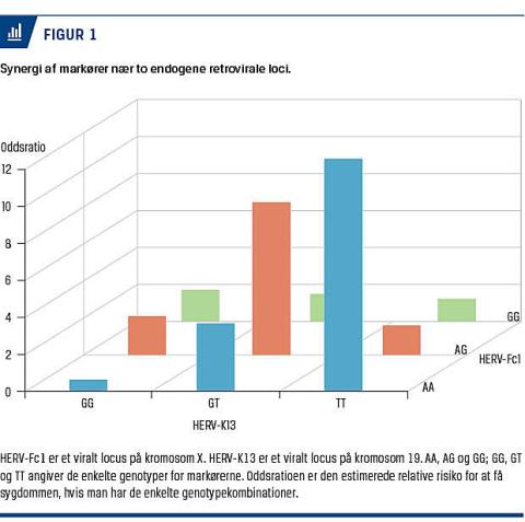 Der var bare et problem: HERV-Fc1 har kun et funktionelt gen, kaldet env. De andre to, gag og pol, er ødelagte. Det kunne vi se på sekvensen. Så der måtte være en hjælper. Efter nogen søgen fandt vi den, HERV-K13 på kromosom 19. Denne har tilsyneladende funktionelle gag- og pol-gener. Dens markører er associerede med skleroserisikoen, om end ikke så kraftigt som HERV-Fc1, og i en statistisk test viste markørerne kraftig synergi med HERV-Fc1-markøren i forbindelse med sygdommen [2]. Det betyder, at de to virus på en eller anden måde hjælper hinanden (Figur 1).