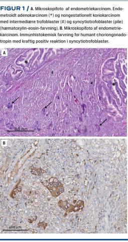 En mikroskopiundersøgelse viste en diffust voksende malign tumor fra endometriet. Tumoren bestod hovedsageligt af endometrioidt adenokarcinom, men indlejret heri fandtes et område med trimorfe maligne trofoblastceller i form af intermediær trofoblast, cytotrofoblast og syncytiotrofoblast (Figur 1A). En immunhistokemisk undersøgelse viste kraftig positiv reaktion i syncytiotrofoblastcellerne for humant choriongonadotropin (hCG) (Figur 1B), hvorimod området med endometrioidt adenokarcinom var kraftigt positivt for markører for denne tumortype (epithelial membrane antigen, paired box gene 8, vimenting og østrogenreceptor). Der var udbredt lymfekarinvasion fra koriokarcinomkomponenten, International Federation of Gynecology and Obstetrics-stadium IB.