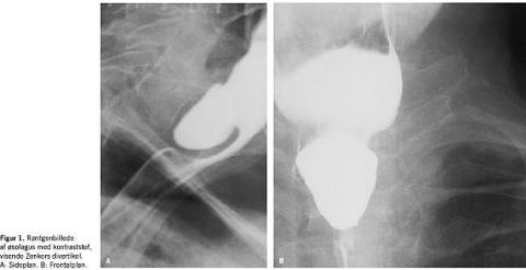Den første anatomiske beskrivelse af et pulsionsdivertikel i øsofagus blev givet af Ludlow [1] i 1769. I 1878 beskrev Zenker [2] den basale patofysiologi ved udvikling af pulsionsdivertiklet, som senere blev opkaldt efter ham. De fleste Zenkers divertikler er lokaliseret opadtil på overgangen imellem hypopharynx og øsofagus. Det drejer sig om uægte divertikler, idet ikke alle lag i øsofagusvæggen findes i divertikelvæggen, muskulaturen mangler. Divertiklerne ses overvejende hos ældre patienter. Symptomerne er synkebesvær, som forværres efter nogle mundfulde, efterhånden som divertiklet fyldes med føde. Herved komprimeres lumen i øsofagus, og føden kan ikke passere. Typisk for patienter med Zenkers divertikel er progredierende vægttab og regurgitation af ufordøjet føde. Diagnosen stilles ved den typiske anamnese og verificeres ved hjælp af røntgenundersøgelse af øsofagus med kontraststof (Figur 1 ).