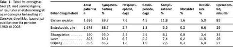 For at mindske risikoen for blødning og mediastinit introducerede Martin-Hirsch [9] i 1993 den endoskopiske staplingteknik. Ved denne behandling deles og staples (klipses) sporen mellem øsofagus og divertiklet i én arbejdsgang. Behandlingen har få komplikationer, og recidivraten er næsten så lav som ved den eksterne teknik (Tabel 1 ). For nuværende er indlæggelsestiden ved staplingbehandling et døgn. Patienterne behøver ikke nasogastrisk sonde, må drikke væske på operationsdagen og genoptage fødeoptagelse dagen efter indgrebet [10].