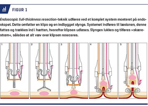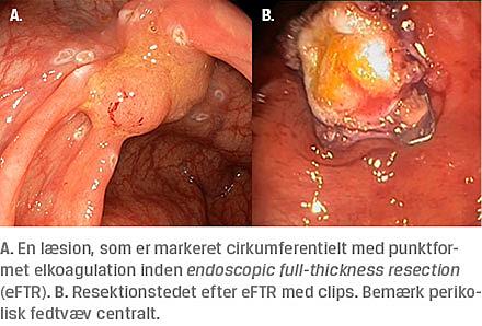 En ny teknik muliggør endoskopisk fjernelse af neoplasier (< 2,5 cm) som fuldvægsresektion i gastrointestinalkanalen, primært colon [1]. Teknikken kaldes endoscopic full-thickness resection (eFTR)(Figur 1). Endoskopisk