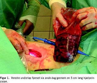 Der foretages som ved en konventionel operation hilus- dissektion og fjernelse af alle lymfeknuder i den opererede thoraxhalvdel. Alle patienter er forberedt til torakotomi, og instrumenter mv. til en hurtig konvertering er klar på stuen. Alle kar deles med specielle vaskulære endoskopiske staplere (endo-GIA), da lungekar er tyndvæggede højflow, lavtryksstrukturer som kræver stor omhyggelighed ved manipulation. Bronkiegrenen til lappen deles ligeledes med en endo-GIA. Alt cancersuspekt materiale inkl. hele lappen fjernes vha. en endo-bag - en plasticpose, hvor præparatet placeres i og trækkes gennem den ikke opspærrede 4-5 cm lange anteriore adgang (Figur 1 ). Kanten af bronkieresektionen sendes til frysehistologisk undersøgelse peroperativt.