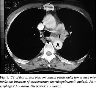Materialet omfatter 84 patienter henvist til thoraxkirurgisk afdeling, Amtssygehuset i Gentofte, i perioden 1.4.1993 til 31.12.1999 med henblik på vurdering af esophagusnære malignitetssuspekte mediastinale forandringer påvist ved CT (Fig. 1 ). Der var 36 kvinder og 48 mænd med en median alder på 62 år (spændvidde 35-82 år).