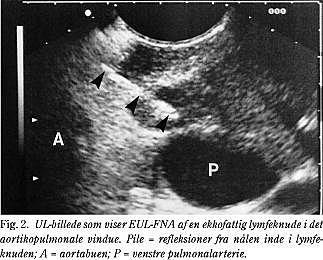 Endoskopisk UL-vejledt biopsi (EUL-FNA) har i de senere år vundet indpas i gastroenterologien, hvor metoden er udviklet til primær diagnostik af pancreastumorer samt til påvisning af lymfeknudemetastaser hos patienter med øvre gastrointestinale tumorer (1, 2). EUL-FNA har herudover vist sig brugbar inden for lungemedicin/thoraxkirurgi, idet metoden giver god oversigt over store dele af mediastinum (3, 4). Der er i dag kun publiceret få studier vedrørende EUL-FNA fra mediastinum (3-11), og metodens indflydelse på den kliniske beslutningsproces er ikke afklaret.