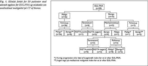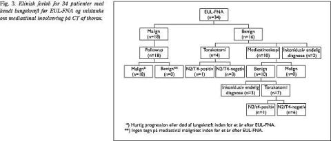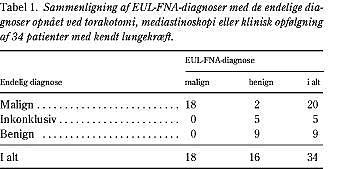 Hos 16 patienter (47%) var EUL-FNA-cytologien benign. Fire af disse patienter fik herefter foretaget torakotomi uden påvisning af mediastinal involvering hos tre patienter (sandt negative). Den fjerde patient fik påvist en malign paraøsofageal lymfeknude ved torakotomien (falsk negativ).