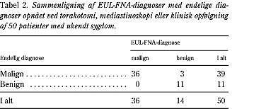 For de 50 patienter med ukendt sygdom før EUL-FNA var de diagnostiske værdier af EUL-FNA, hvad angår mediastinal malignitet, følgende: sensitivitet 92%, specificitet 100%, PPV 100%, NPV 79% og accuracy 94%.