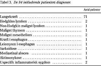Resultater: For de 79 patienter, hvor der blev opnået tilstrækkelig verifikation, havde EUL-FNA følgende diagnostiske værdier mht. at stille diagnosen kræft i mediastinum: sensitivitet 92%, specificitet 100%, positiv prædiktiv værdi 100%, negativ prædiktiv værdi 80% og accuracy 94%. For 18 af 37 patienter (49%) blev en torakotomi undgået, og for 28 af 41 patienter (68%) blev en mediastinoskopi undgået som følge af EUL-FNA. Otte patienter fik stillet diagnosen småcellet lungekræft og blev henvist til kemoterapi som følge af EUL-FNA-diagnosen. Tre patienter fik stillet en specifik benign diagnose ved EUL-FNA (sarkoidose, mediastinal absces og esophagus-leiomyom) og kunne herefter påbegynde specifik behandling.