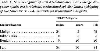 En sammenligning af EUL-FNA-diagnoser med endelige diagnoser opnået ved torakotomi, mediastinoskopi eller klinisk followup fremgår af Tabel 4 .