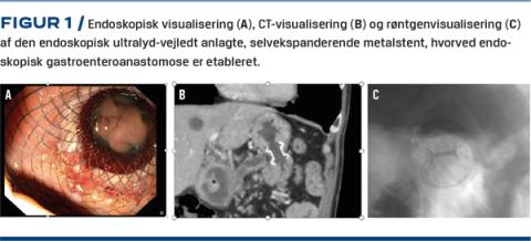 Hæmmet passage af indholdet fra mavesækken til tarmen kan opstå som følge af både benign (akut og kronisk pankreatitis, ulcussygdom) og malign sygdom (pancreas- og duodenalcancer). Traditionelt består behandlingen i enten kirurgisk etablering af en gastroenteroanastomose (GEA) eller endoskopisk indsættelse af en duodenalstent. Nogle patienter er imidlertid ikke kandidater til kirurgi. Hos disse patienter kan EUS-vejledt anlæggelse af GEA udgøre et minimalt invasivt alternativ. Der anvendes flere teknikker, men fælles for dem alle er, at det tyndtarmssegment, der ønskes anastomoseret til ventriklen, fyldes med vand/røntgenkontrast via en endoskopisk anlagt nasojejunal sonde. Derefter punkteres tarmen EUS-vejledt fra ventriklen med efterfølgende transluminal indførelse af en SEMS (Figur 1) [15, 16]. En metaanalyse viser, at proceduren er teknisk mulig hos 94%, og der opnås tilfredsstillende klinisk effekt hos 90% [17]. Raten af alvorlige eller fatale komplikationer ligger på omkring 3%, mens raten af milde til moderate komplikationer ligger på omkring 11% [17]. Ud over klassisk obstruktion af duodenum kan proceduren også anvendes ved obstruktion af Roux-en-Y-slynger [18].
