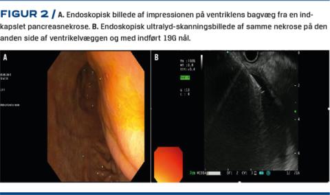 Ved behandling af indkapslet pancreasnekrose har EUS-vejledt drænage og minimalt invasiv kirurgi vist sig at være åben kirurgi overlegne med lavere morbiditet og mortalitet [21, 22]. Et randomiseret studie har endvidere vist, at EUS-vejledt drænage var minimalt invasiv kirurgi ligeværdig, hvad angår død og større alvorlige komplikationer, hvorimod der var signifikant færre fistelkomplikationer og kortere indlæggelsestid ved EUS-vejledt drænage [23]. Ved EUS-vejledt drænage identificeres et egnet indstikssted endoskopisk og ultrasonografisk (Figur 2). Herefter anlægges et transgastrisk eller transduodenalt stoma, hvorigennem der indsættes enten plastikstents eller en SEMS sammen med et nasocystisk skyllekateter til irrigation med antibiotika eller saltvand [2]. Hvis drænagen ikke i sig selv er sufficient, kan der igennem stomaet foretages direkte endoskopisk nekrosektomi [24]. Hvorvidt SEMS er bedre end plastikstents, er fortsat uafklaret. En metaanalyse viste, at SEMS hyppigere medførte heling af pancreasnekroserne og var forbundet med færre blødningskomplikationer, hvorimod der ikke var forskel i mortalitet eller alvorlig komorbiditet [25].
