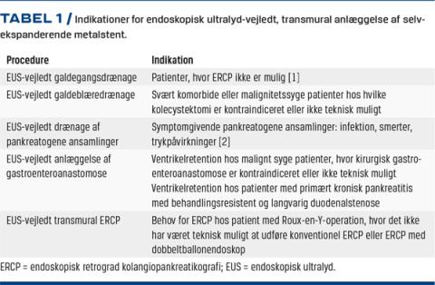 Formålet med denne artikel er at give læseren et overblik over anvendelsesmuligheder for terapeutisk EUS til etablering af anastomoser med SEMS ved øvre gastrointestinale lidelser. Overblik over indikationer for de forskellige procedurer fremgår af Tabel 1.