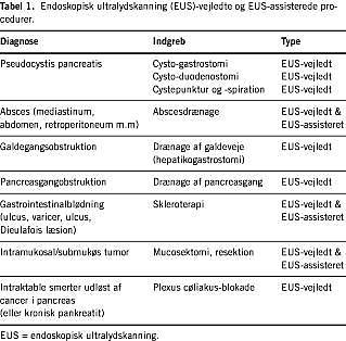 Ved endoskopisk ultralydskanning (EUS), hvor man kombinerer en almindelig øvre (eller nedre) endoskopi med et simultant ultralydbillede, er det muligt visuelt at erkende både lumen, gastrointestinalvæggen og de omkringliggende strukturer og organer både i abdomen og i mediastinum (Figur 1 ). Som følge af ultralydtransducerens nære kontakt med strukturer og organer opnås der meget detaljerede ultralydbilleder, hvilket åbner mulighed for EUS-vejledt biopsi og intervention i områder, som ellers kun er tilgængelige ved åben operation. Ved nedenstående summariske gennemgang belyses en række kliniske situationer, hvor EUS kan være eneste behandlingsmulighed, eller hvor EUS er et vigtigt minimalt invasivt alternativ til kirurgi.