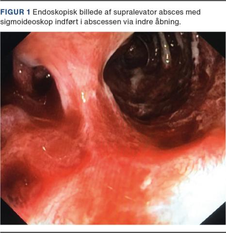 En 64-årig mand blev indlagt med anale defækationssmerter gennem fire døgn. Fem år tidligere havde han haft en »ansamling i rectum«, som blev dræneret. Patienten havde atrieflagren, type 2-diabetes mellitus, adipositas, hypertension og hjerteinsufficiens. Ved den kliniske undersøgelse, inkl. endoanal UL-skanning (EAUL) og anoskopi, konstateredes en stor supralevator absces ved kl. 5-7 strækkende sig fra linea dentata til niveau med prostatas overkant klos på rectum (Figur 1). Ved kl. 6 så man en indre åbning i et større ulcus med pussivning. Fra den indre åbning fødtes tillige en lav transsfinkterisk fistel. Fundene blev bekræftet med MR-skanning.