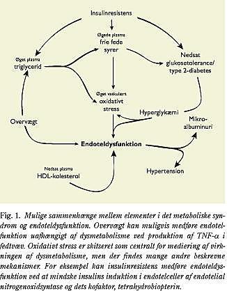 Ændret funktion af det vaskulære endotel opfattes som den tidligste påvirkning af blodkar ved udvikling af aterosklerose (1). Alle elementerne i det metaboliske syndrom er forbundet med endoteldysfunktion, som derfor kan forklare sammenhængen mellem det metaboliske syndrom og hjerte-kar-sygdom. På den anden side nedsætter fysisk aktivitet og god kondition den kardiovaskulære mortalitet (2), og motion bedrer flere af elementerne i det metaboliske syndrom. I det følgende vil de mulige årsagssammenhænge mellem det metaboliske syndrom og endoteldysfunktion blive gennemgået for hvert af elementerne i det metaboliske syndrom: insulinresistens, nedsat glukosetolerance og type 2-diabetes, overvægt, dyslipidæmi, hypertension og mikroalbuminuri. Til slut vil betydningen af motion blive beskrevet.