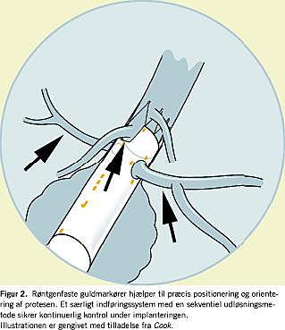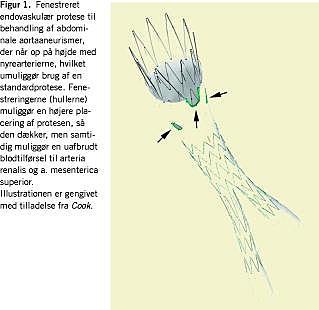 Stentgrafter såvel i den torakale som den abdominale aorta kan også tilbydes med såkaldt fenestrering, dvs. med åbninger beregnet for afgang af kar, når karanatomien umuliggør placering af en standardendostent (Figur 1 og Figur 2 ). Disse fenestrerede endostenter har udvidet det terapeutiske område for endovaskulær behandling til hele aorta, inklusive aortabuen og området med afgangen af de viscerale arterier. Denne seneste type af endovaskulær behandlingsform har status som udviklingsområde. Med tiden vil dette betyde en yderligere øgning af minimalt invasive indgreb, og at de store åbne, kombinerede torakale og abdominale aortaingreb måske minimeres.