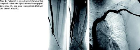 Fistulografi udførtes via et indstik i afløbsvenen (Figur 1A ) efter anlæggelse af en blodtryksmanchet centralt for indstiksstedet, der var pumpet op til et tryk over det systoliske. Efter kontraststofinjektion retrogradt i fistlen visualiseredes anastomosen mellem venen og arterien (vinduet) (Figur 1 B). Herefter fjernedes trykket i manchetten, og resten af afløbet visualiseredes helt ind til højre atrium (Figur 1C). Hvis vinduet var mangelfuldt fremstillet trods stase, blev der suppleret med ultralydsskanning. I tilfælde af stenose(r) (> 50% sammenlignet med tilstødende karsegment med normal diameter) eller okklusion af fødearterien, vinduet eller afløbsvenen henvistes patienten til PTA.