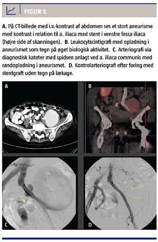 En leukocytscintigrafi viste opladning i aneurismet (Figur 1B), og ved bloddyrkninger fandt man koagulasenegative stafylokokker, hvilket er foreneligt med et mykotisk aneurisme. Aneurismet udgik fra den stentbehandlede venstre a. iliaca communis og blev ukompliceret ekskluderet ved indsættelse af en stentgraft (Fluency 9 mm bred og 8 cm lang coated stent, Figur 1C + D). Patienten blev samtidig sat i antibiotisk langtidstabletbehandling med moxifloxacin 400 mg × 1 dagl. Ved kontrol seks måneder senere var der ved UL-skanning puls i venstre lyske og intet flow i aneurismet, og en efterfølgende CT viste tydelig skrumpning af aneurismet. Patienten gik ad mortem et år efter indsættelsen af stentgraften pga. opblussen i leukæmien.