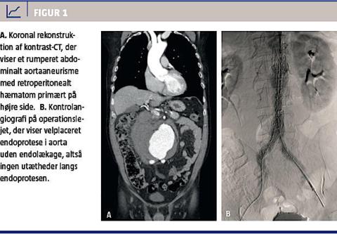 En akut CT med intravenøs kontrast afslørede et 9,4 cm bredt, infrarenalt RAAA (Figur 1A). På baggrund af de anatomiske forhold fandtes det pågældende RAAA egnet til endovaskulær behandling. På en hybridstue (dvs. en operationsstue, hvor der også er mulighed for radiologisk intervention) implanterede man i lokal anæstesi via begge lysker en aorto-biiliakal endoprotese (Figur 1B). Postoperativt kunne patienten mobiliseres efter få timer. Der var normal fodpuls bilateralt og ingen tegn på hæmatomer i