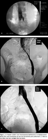 i v. cava inferior (altid på venstre side), som dilateres og stentbehandles (Figur 1 ). Den tekniske succesrate, hvad angår opløsning af tromben og stentbehandlingen, angives at være på 90% eller derover, og omkring 60-90% er åbne efter et år [1]. Vor egen erfaring ved femoro-iliakal DVT er mindst lige så god efter behandling af de første 40 patienter.