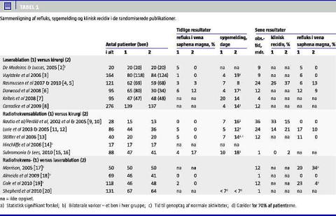 I alt 762 patienter indgik i de seks studier, der blev rapporteret i syv publikationer (Tabel 1). I fire studier opgav man den tekniske succesrate, altså ophævet refluks, og den var ikke signifikant forskellig de to metoder imellem [2-4, 6]. I to studier fandt man signifikant færre smerter efter laserbehandling i dagene efter indgrebene, mens man i de øvrige studier ikke fandt nogen sådan forskel [4, 8]. Hæmatom- eller ekkymosestørrelsen blev vurderet i to serier, og den blev i begge fundet at være signifikant mindre efter laserbehandling end efter åben kirurgi [2, 7]. Sygemeldingsperioden var signifikant kortere efter laserbehandling i tre serier, mens der ikke fandtes forskel i de øvrige tre serier (Tabel 1). Langtidsresultaterne opgjort efter mediant knap et år (spændvidde: 4-24 måneder) viste i ingen af de seks studier nogen signifikant forskel i forekomsten af refluks (Tabel 1).