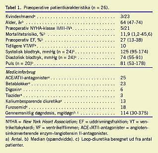 I perioden januar 2002 til oktober 2007 fik 26 patienter foretaget venstre ventrikelaneurismektomi (Tabel 1). Ti af patienterne havde haft tilfælde med ventrikulær takykardi eller ventrikelflimren. Alle patienter havde ægte aneurismer (Figur 1), heraf i et enkelt tilfælde med indhold af en salmonellainficeret parietaltrombe. På trods af at alle patienter kunne anses for at være optimerede i deres medicinske hjerteinsufficiensbehandling (se Tabel 1), var ingen af dem i New York Heart Association (NYHA)-klasse I før operationen. Fem patienter var i NYHA-klasse II, 15 i klasse III og seks i klasse IV. Beregnet ud fra Logistic Euroscore kunne den perioperative mortalitetsrisiko beregnes til 11,9% (1,2-45,6%) [6]. To af operationerne var subakutte. Fem patienter havde implantable cardioverter defibrillator (ICD)-pacemaker præoperativt.