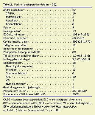 Toogtyve patienter (85%) fik samtidig udført andre procedurer (Tabel 2). Seksten fik foretaget CABG (62%), tre mitralplastik (12%) og tre aortaklapsubstitution (12%). Kryoablation af aneurismets randområde blev udført hos otte patienter (31%), hvor man præoperativt fandt en øget risiko for malign ventrikulær arytmi. ECC-tiden (108 (47-299) min.) og tiden med standset hjerte (iskæmitiden; 60 (0-96) min.) varierede betragteligt, især afhængigt af de nødvendige supplerende operative procedurer. I ni tilfælde (35%) aflukkedes den apikale defekt med patch efter aneurismeresektionen, og i 19 tilfælde anvendtes en seizing- ballon (73%), Tabel 2.