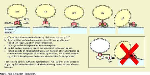 Hiv's komplicerede indtrængen i cellen er i løbet af de senere år blevet kortlagt. Hiv er udstyret med to kappeproteiner; det transmembrane gp41, og det dertil løst bundne gp120 (Figur 1 ). Kappeproteinerne er på gp41-niveau bundet sammen tre og tre i såkaldte trimere. Hiv's første kontakt med cellen foregår via gp120, der binder sig til CD4-receptoren. Denne binding medfører konformatoriske ændringer i gp120, og områder, der tidligere har været skjult (for antistoffer), bliver nu tilgængelige for næste receptor, en kemokinreceptor - enten CCR5 eller CXCR4. Bindingen til disse receptorer medfører, at gp41 - der indtil da har været »låst« - begynder at rulle op om sig selv for derved at bringe viruskappen og cellemembranen i kontakt med hinanden og få dem til at fusionere. Denne rullen op om sig selv involverer to komplementære dele af gp41.