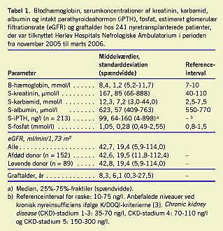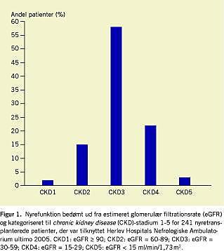 Materiale og metoder: Der blev foretaget en tværsnitsundersøgelse af samtlige nyretransplanterede patienter, der var tilknyttet Herlev Hospitals Nefrologiske Ambulatorium, og hvis nyregraft fortsat fungerede (n = 241). Oplysninger om alder, køn, renal grundsygdom, transplantationstidspunkt, nyrefunktion på opgørelsestidspunktet, udvalgte biokemiske variabler og igangværende immunsuppressive behandling blev udhentet fra journaler. Undersøgelsen blev gennemført i perioden fra november 2005 til marts 2006.