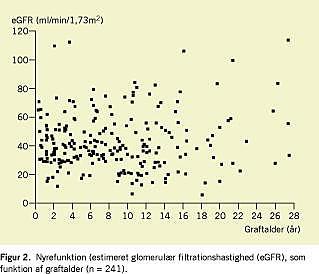 Den gennemsnitlige graftalder var 8,3 år. I Figur 2 er nyrefunktionen afbildet som funktion af graftalder. Der var ingen signifikant sammenhæng. Det bemærkedes, at der blandt de tre patienter med længstfungerende grafter (graftalder 27,5 år) var en patient med fuldgod nyrefunktion (114 ml/min/1,73 m2 ).