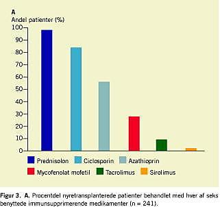 Resultater: Der var en ligelig kønsfordeling (131 mænd, 110 kvinder) blandt de transplanterede. Gennemsnitsalderen var 52 år (standarddeviation: 12 år). Den gennemsnitlige glomerulære filtrationshastighed var 43 ml/min/1,73 m 2 (spændvidde 6-114 ml/min/1,73 m 2 ) og den gennemsnitlige graftalder var 8,3 år (spændvidde 0-28 år). Der blev fundet en betydelig forekomst af hyperparatyroidisme (64%). Hovedparten (74%) af patienterne var i trestofimmunsuppressiv behandling, oftest med kombinationen prednisolon-ciclosporin-azathioprin (46%). De senere år er forbruget af azathioprin faldet, mens forbruget af mycofenolat mofetil er steget. Prednisolon og ciclosporin benyttes fortsat til langt de fleste patienter, mens tacrolimus i de seneste år har været taget i anvendelse hos udvalgte patienter.