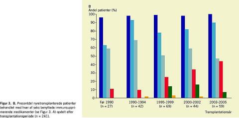 På Herlev Hospital har man siden 2005 foretrukket mykofenolat mofetil som antimetabolit frem for azathioprin, som ellers har været anvendt lige siden starten af transplantationsæraen. Patienter, som er blevet transplanteret efter 2005, omstilles kun til azathioprin ved uacceptable bivirkninger af mykofenolat mofetil (først og fremmest gastrointestinale gener). Den ændrede praksis afspejles i Figur 3 B, hvoraf det fremgår, at også patienter, som er blevet transplanteret tidligere end 2005, i stadig stigende grad er omstillet til mykofenolat mofetil. Skiftet fra azathioprin til mykofenolat mofetil er begrundet i undersøgelser, som tyder på en bedre graftoverlevelse ved anvendelse af mykofenolat mofetil [12]. Hvorvidt der reelt er fordele ved at vælge mykofenolat mofetil, diskuteres dog stadig [13].