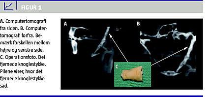 Objektivt fandt man en forværring af smerterne ved palpation intraoralt lige lateralt for tonsillejet i venstre side, hvor der også kunne palperes væsentlig mere fasthed end på højre side. En computertomografi (CT) af collum og ansigtsskelettet tydede på ossifikation af ligamentum stylohyoideum på venstre side med kraftig knogledannelse og to pseudoled (Figur 1 ). Højre side var normal. Det blev vurderet, at der var indikation for operation.