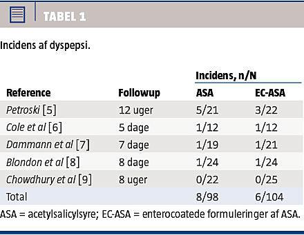 Vi fandt ingen studier, hvor man målte på forekomsten af dyspepsi som primært endepunkt, men i fem studier opgjorde man gastrointestinale symptomer som sekundære endemål (Tabel 1). Der blev ikke fundet nogen statistisk signifikant forskel mellem incidensen af dyspepsi hos personer, der var blevet behandlet med hhv. ASA og EC-ASA (8/98 vs. 6/104, sample size weighted pooled proportions p = 0,59).